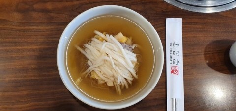 자리에 앉아 평양냉면을 주문하고 선불로 계산을 마치면 면수를 가져다줍니다. 다른 평양냉면 가게의 면수와 색에 조금 차이가 있습니다. 자리에 앉아 차를 마시듯이 면수를 마시면서 속과 급한 마음을 달랩니다. 기다리다 보면 주인공인 평양냉면이 나옵니다.