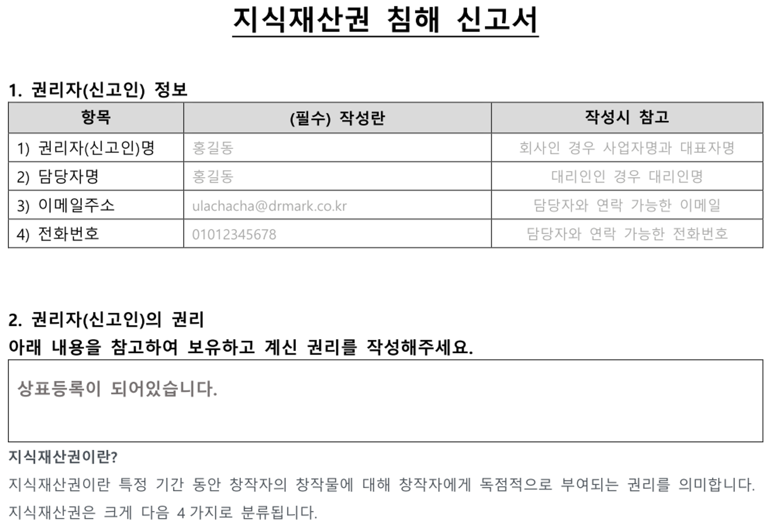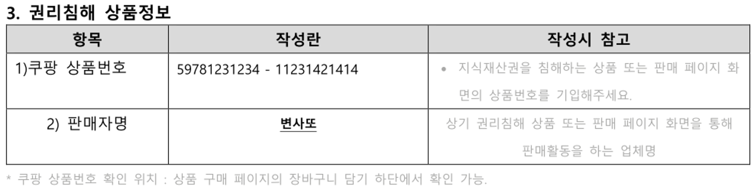 위의 예시와 같이 침해신고서를 작성해주시고, 개인정보활용동의를 해주세요. 권리자에는 상표권자의 이름과 담당자의 연락처를 기재해주면 됩니다. (참고: 상표권자와 판매자가 동일하여야 처리가 용이하므로 상표출원시에 사업자 명으로 상표출원을 하는 것을 추천드립니다.) 권리 부분에는 "상표등록(등록번호 제40-1234567호)이 되어 있습니다."와 같이 기재해주시고, 상품번호와 판매자명을 기재해줍니다. 이때 판매자명은 현재 매칭된 상품에서 보이는 판매자를 적어주시면 됩니다. 마지막으로 신고사유에는 "[상표명]에 대해서 상표권(등록번호 제40-1234567호, 이하 "등록상표"라 함)를 보유하고 있습니다. [판매자(제3자)]는 원판매자가 보유한 등록상표를 사용할 정당할 권리 없이 상표권과 동일 또는 유사한 범위에서 상표를 사용하여 상표권을 침해하고 있는바, 해당 상품의 아이템위너 분리 및 향후 아이템매칭이 되지 않도록 조치하여 주시기를 요청드립니다."와 같이 기재해주세요.