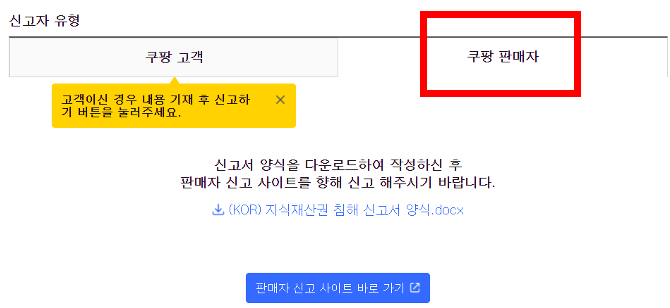 신고자 유형은 우리는 판매자니까 <쿠팡 판매자>를 선택하시면 됩니다. 여기서 "(KOR) 지식재산권 침해 신고서 양식.docx"를 다운받아서 작성해주시면 됩니다.