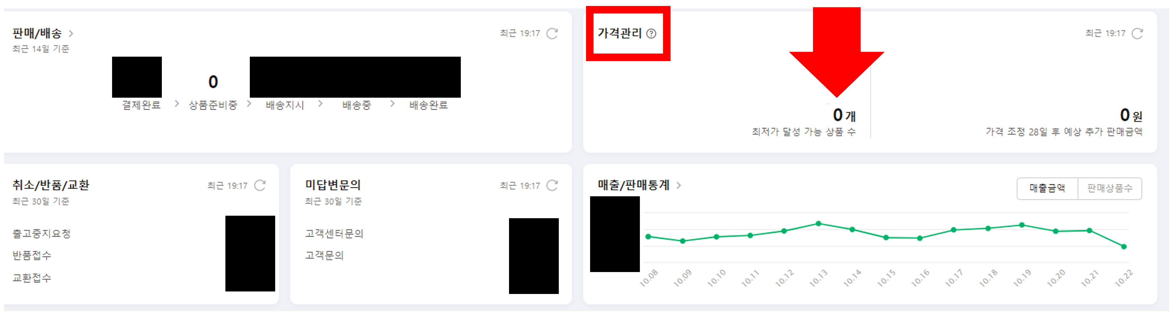 판매중인 상품이 아이템위너에 매칭되었는지 여부는 판매자 페이지에서 가격관리 부분의 최저가 달성 가능 상품 수에서 찾아보실 수 있습니다. 위 그림에서 보는 것처럼 매칭된 상품이 있으면 최저가 달성 가능 상품 수에 숫자가 올라가게 됩니다. 그러면 최저가 달성 상품으로 안내된 상품의 상세페이지, 즉 아이템위너가 매칭된 상품의 상세페이지로 이동하시면 됩니다.