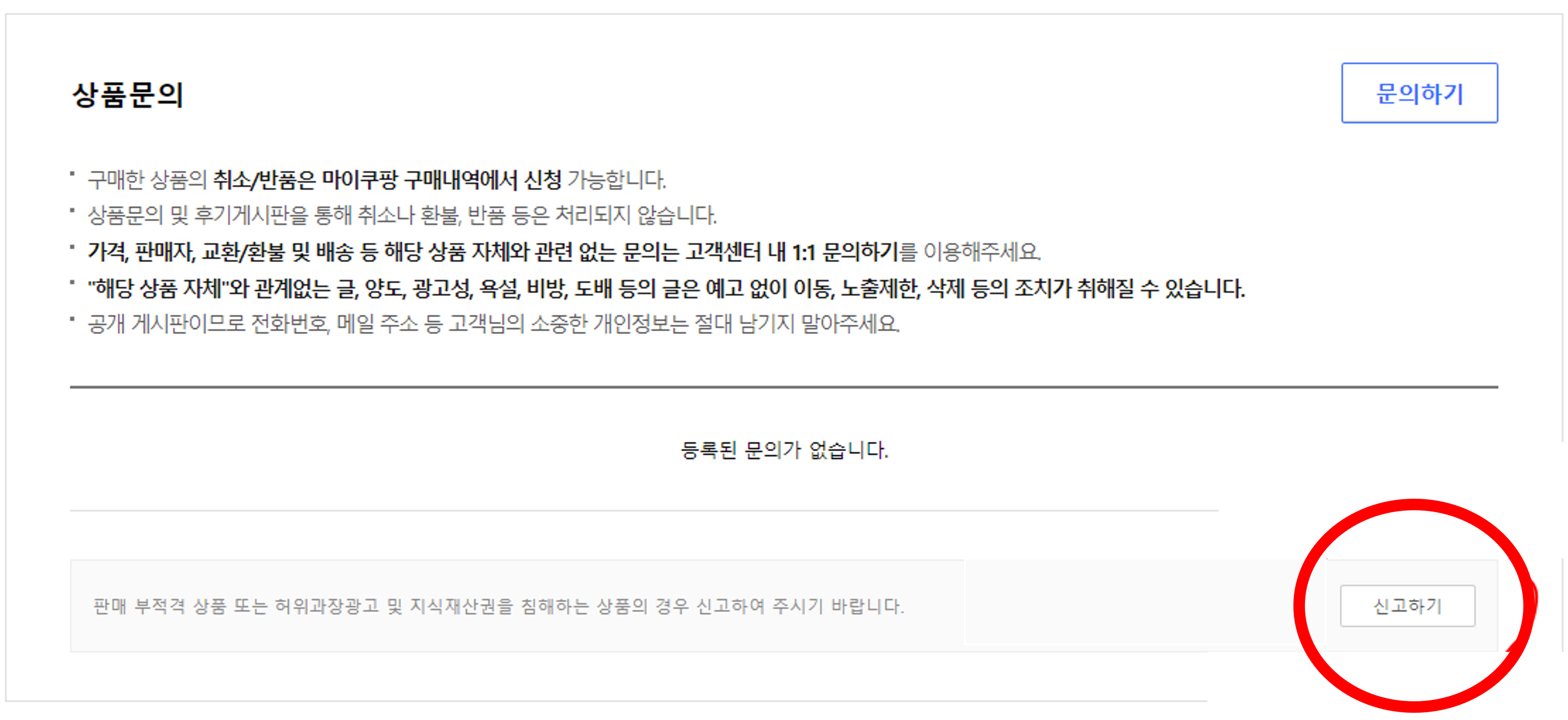 아이템위너로 매칭된 상품의 상세페이지에 가면 판매자가 다른 사람으로 되어 있는 것을 확인할 수 있을겁니다. 해당 페이지에서 상품문의 부분을 보시면 신고하기가 있는 것을 확인할 수 있습니다. 이 신고하기를 클릭합니다.