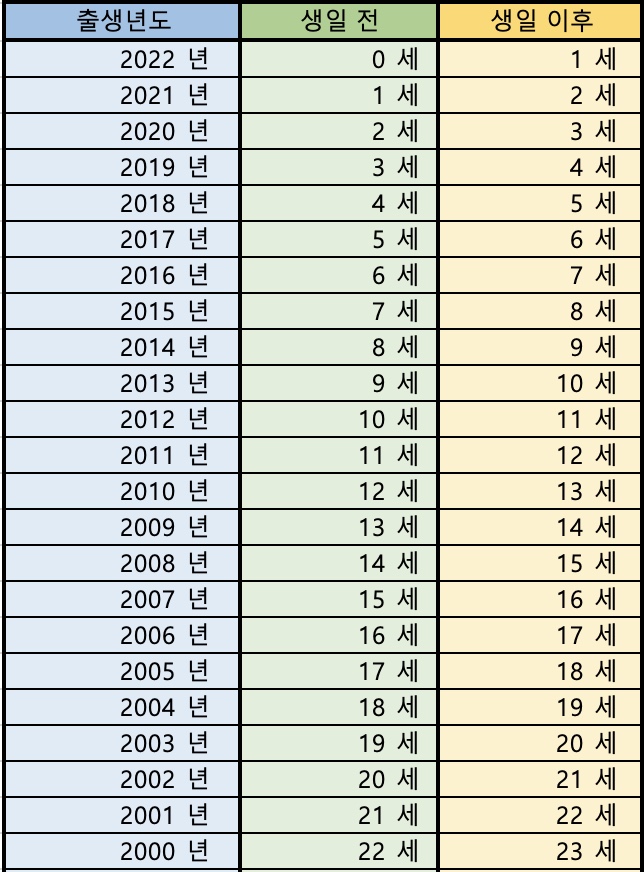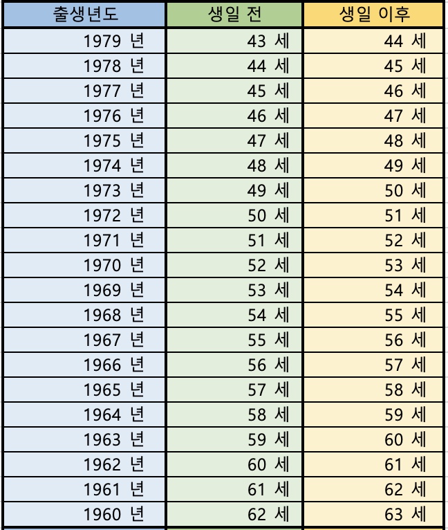 기준이 되는 생일은 양력입니다. 그러니까 아래 표에서 생일이 아직 안된 분들은 <생일 전> 나이가 본인의 나이가 되며, 생일을 맞이한 분들을 <생일 이후>가 본인의 나이가 됩니다.