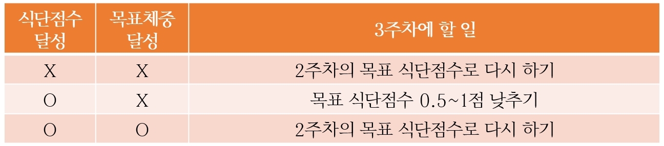 2주 차를 보내면서 목표 식단 점수와 목표 체중을 모두 달성한 분이라면 고민 없이, 3주 차에도 2주 차의 목표 식단 점수와 같은 식단 점수를 목표로 하시면 됩니다.