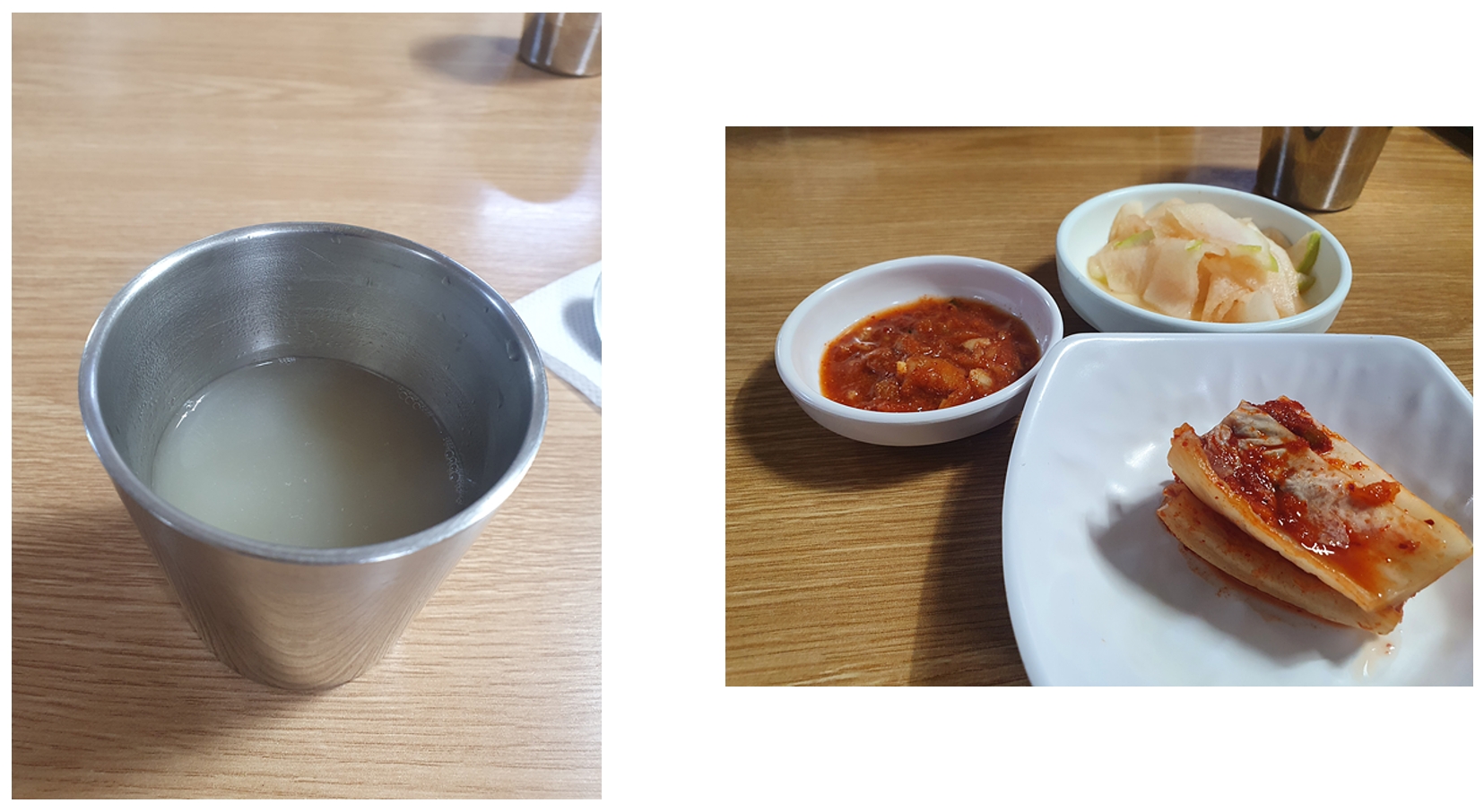 자리에 앉아 평양냉면과 만두를 시켰습니다. 가장 먼저 추운 날씨와 허기진 배를 달래줄 면수가 나왔습니다. 무심히 면수를 한모금 마셨습니다. 약간 무거운 느낌의 면수가 생각보다 마음에 들었습니다. 밑반찬으로는 김치와 무가 나옵니다. 좌측 위에는 만두를 찍어먹을 양념장입니다. 그냥 간장이 아니라 겨자가 조금 들어간 특이한 맛입니다. 뒤에서 다시 말하겠지만 만두와 무척 잘 어울립니다. 잠깐 기다리니 만두보다 먼저 평양냉면이 나왔습니다.