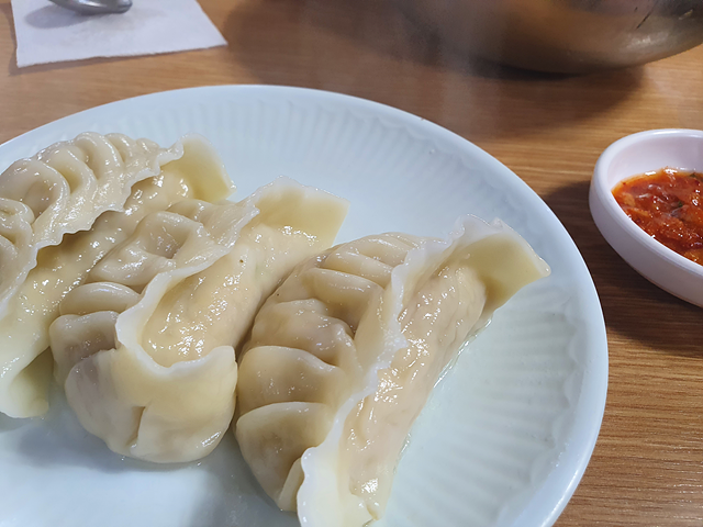 이 집의 다른 추천메뉴는 접시만두입니다. 이북식 만두 중에서는 진미평양냉면의 접시만두가 단연코 최고입니다. 한입 베어 물면, 이북식 만두의 담백함과 피 안에 고여 있는 적당한 육즙이 조화를 이룹니다. 마치 크기가 큰 소룡포를 먹는 것 같은 느낌입니다. 진미평양냉면에서 주는 특이한 양념장을 만두에 더해 먹으면 더욱 좋습니다.