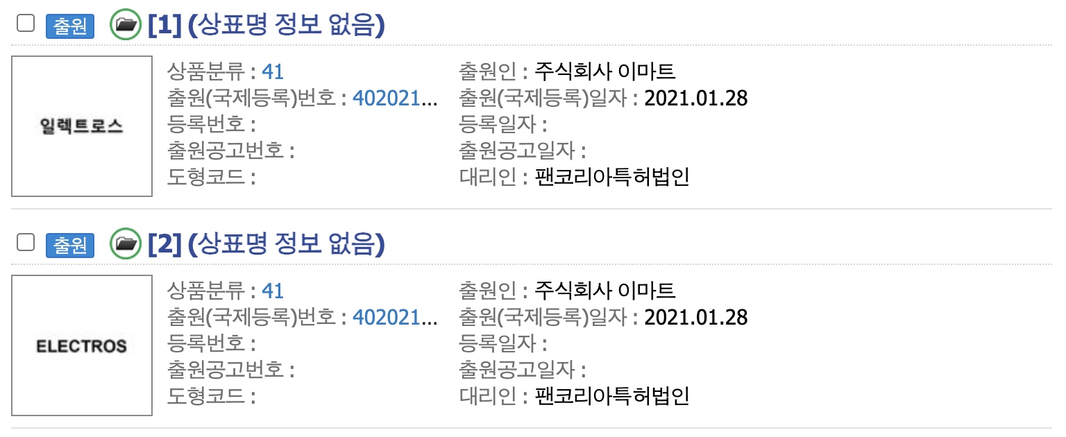 그런데 지난 1월 28일 신세계 그룹에 속하는 주식회사 이마트에서 일렉트로스(ELECTROS)에 대해서 스포츠시설제공업 등을 지정해서 상표출원을 하였습니다.