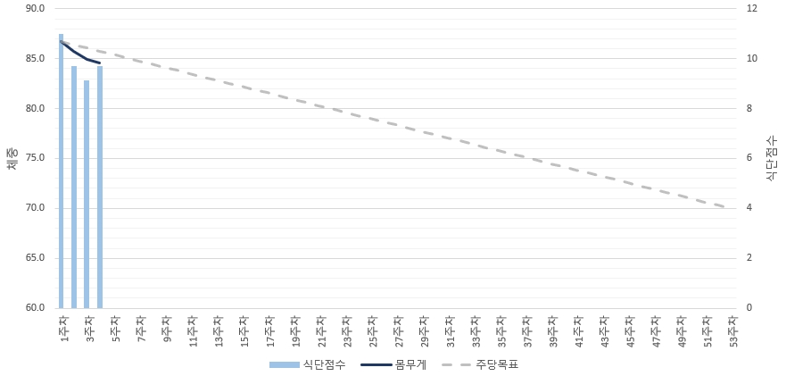 4주차에는 목표했던 식단점수인 10점보다 낮은 점수인 9.7점이었습니다. 목표 점수는 달성했는데, 체중은 3주차 84.9 kg에서 300g 정도 빠졌습니다. 목표했던 400g에 미치지 못했습니다. 2주동안 매주 900 g씩 빠졌으니, 이제 조금 감량폭이 줄어들 때도 된 것 같습니다.