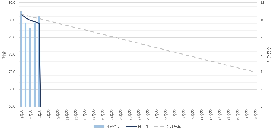 지금까지 86.7 kg에서 84.0 kg으로 2.7 kg을 감량했습니다. 5주차는 실패를 했기에, 6주 차에는 5주 차와 동일한 목표로 다시 도전합니다.