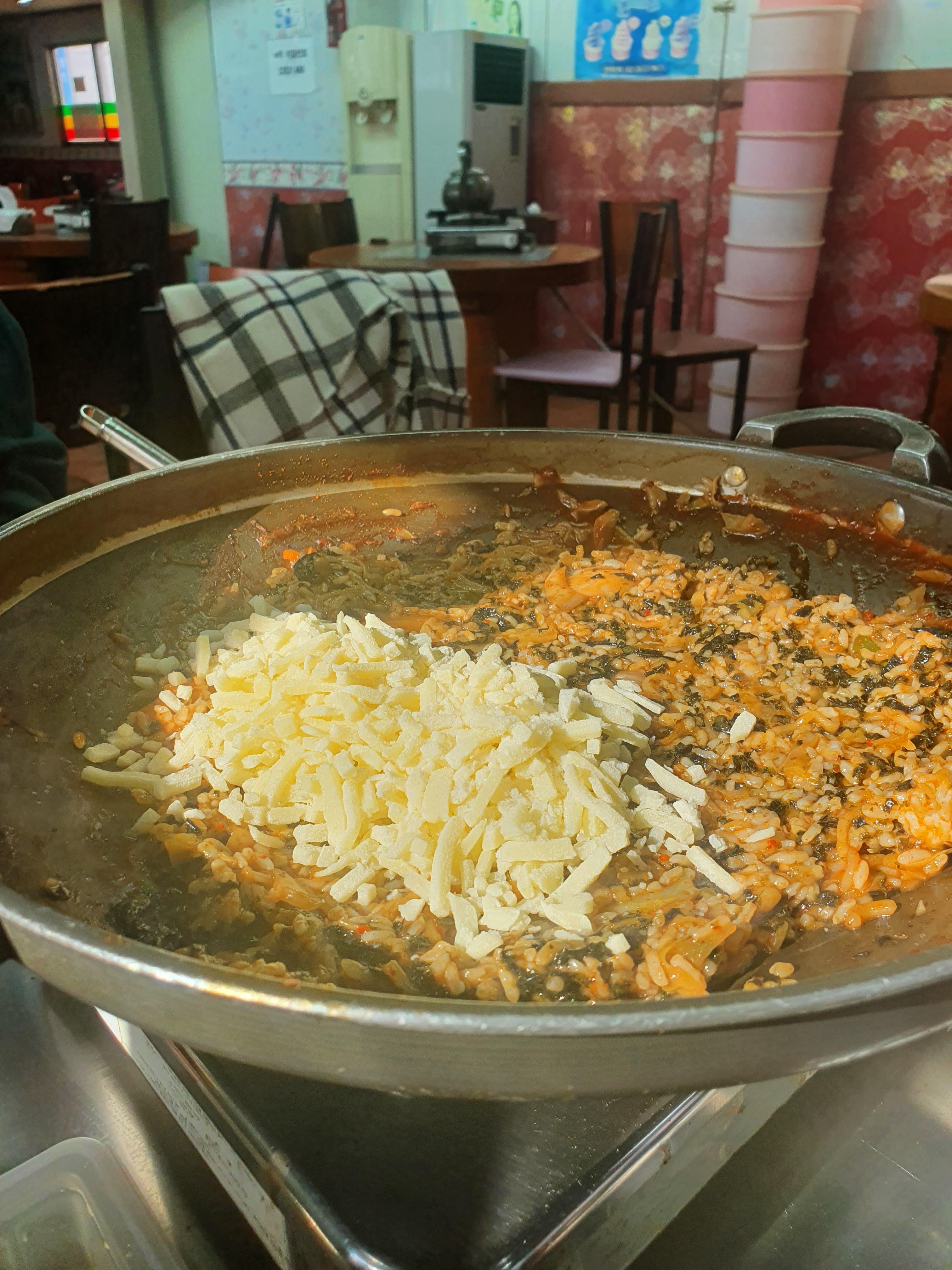 마지막으로 볶음밥을 볶아서 먹습니다. 밥 1인분의 양이 생각보다는 많습니다. 적당히 부른 배를 볶음밥으로 마무리해줍니다. 치즈는 따로 추가해야 합니다. 닭갈비집처럼 덮개를 덮어서 치즈를 녹여주거나 하지는 않습니다. 볶음밥이 적당히 바닥에 눌어붙었다 싶으면 치즈랑 함께 섞어주면 치즈가 잘 녹습니다.