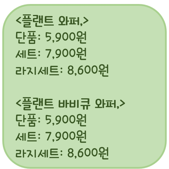 가격은 플랜트와퍼와 플랜트 바비큐 와퍼가 서로 동일합니다. 단품 5,900원, 세트 7,900원, 라지 세트 8,600원입니다. 무게는 309g으로 와퍼보다 31g 무겁습니다. 칼로리도 플랜트와퍼 기준 704 kcal로리 와퍼(619 kcal)보다 무려 85 kcal나 더 높습니다. 베지테리안을 위한 햄버거라 칼로리가 낮을 거라는 편견을 버려야겠네요. 다이어트를 생각하시는 분이라면 그냥 와퍼를 드시는 것을 추천드립니다.
